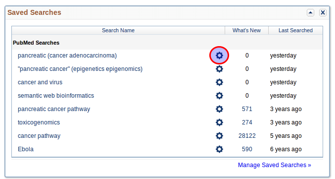 Now that you’ve created a search, you can save the query and re-execute it later. You can even schedule the search to execute periodically, and send you an email message with the results. To do this, you’ll need to create a MyNCBI account. They’re free, and you can signup here. Once you’ve saved your search click on the blue gear button (shown with a red circle around it in the screenshot).