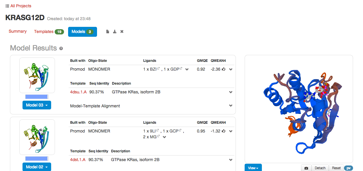 Expasy, the folks that brought you all SwissProt, have an interesting tool called SwissModel that lets you model a protein given a protein sequence. I was curious about KRASG12D, so I pasted the edited sequence into SwissModel, and this was the result.