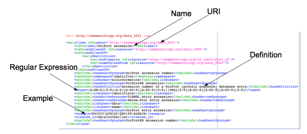 Firstly, it tells us that there’s an entity called a UniProt accession. At has a URI that uniquely identifies it within the ontology. It has a plain-English definition for that entity is. Gives us an example of what it looks like, and provides us with a regular expression that we can use to validate an accession.